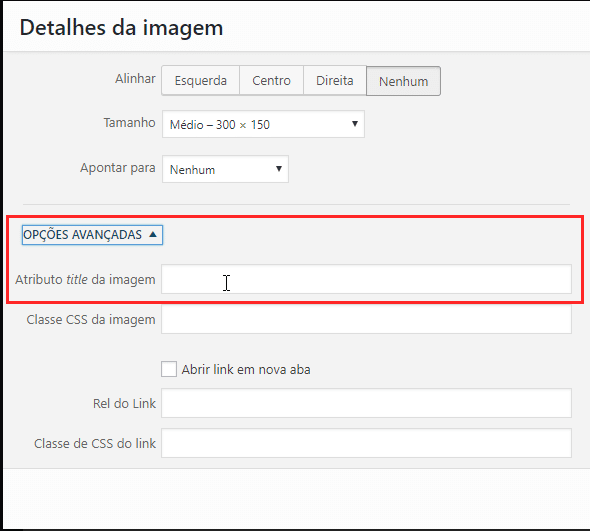 Na janela “Detalhes da Imagem” ao clicar em “OPÇÕES AVANÇADAS” você irá ver a opção para inserir o atributo title das suas imagens: