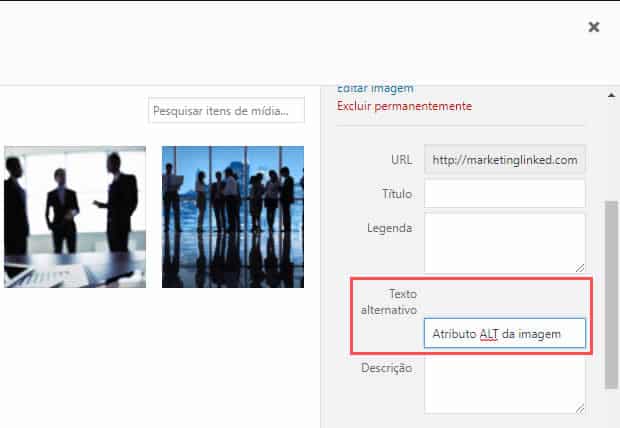 Ao adicionar midia no wordpress tem opções para inserir o atributo alt em uma imagem: